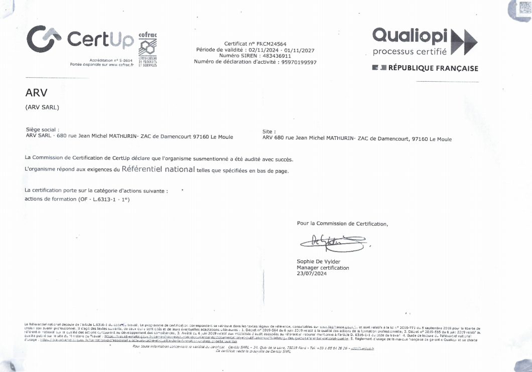- par courrier adressé à Responsable du service de réclamations de ARV FORMATIONS ZAC de DAMENCOURT 97160 LE MOULE